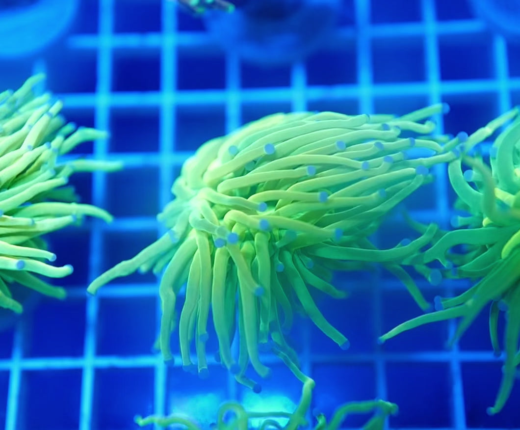 Worshipped by collectors and revered in reef circles, the Holy Grail Torch stands at the top of Euphyllia royalty. With molten gold tentacles, emerald green undertones, and electric blue tips, this coral is pure fire and elegance wrapped into one showpiece frag.