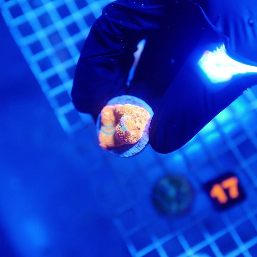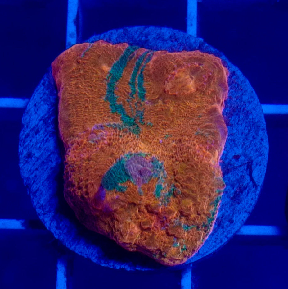 The Orange Crush Chalice is a longtime collector favorite known for its vibrant orange mouths set against a bold, textured base ranging from deep red to metallic copper. This coral glows under actinics, with its signature contrast between eye and body giving it a molten, high-impact look in both frag and colony form.