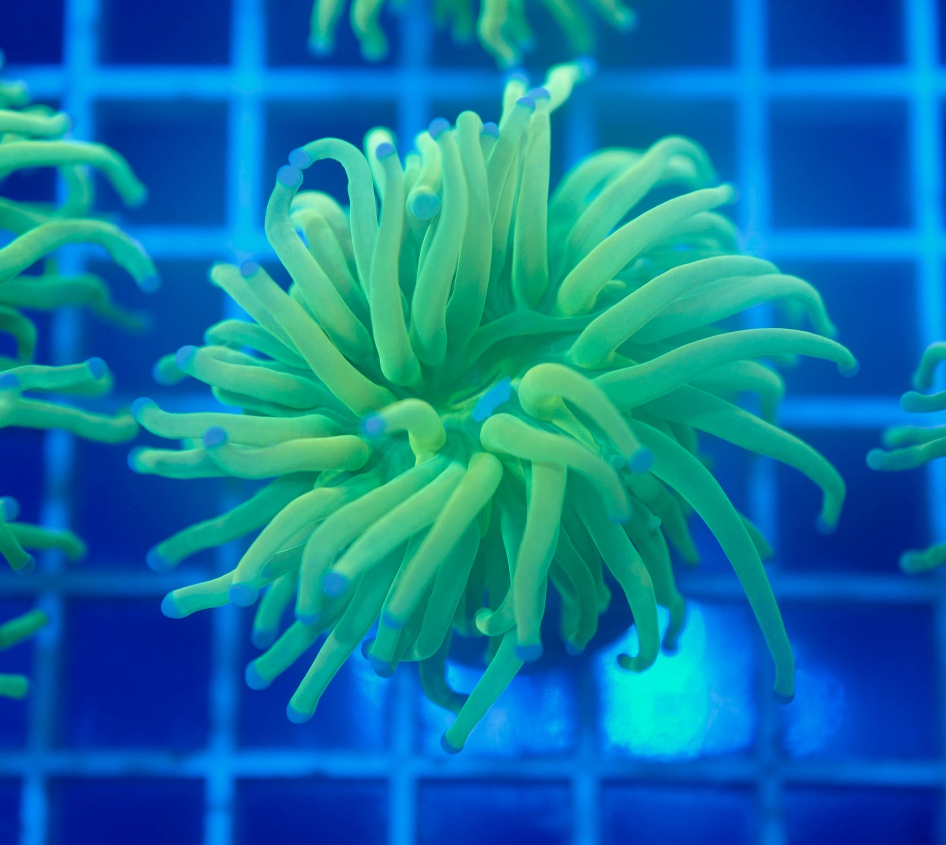 Worshipped by collectors and revered in reef circles, the Holy Grail Torch stands at the top of Euphyllia royalty. With molten gold tentacles, emerald green undertones, and electric blue tips, this coral is pure fire and elegance wrapped into one showpiece frag.
