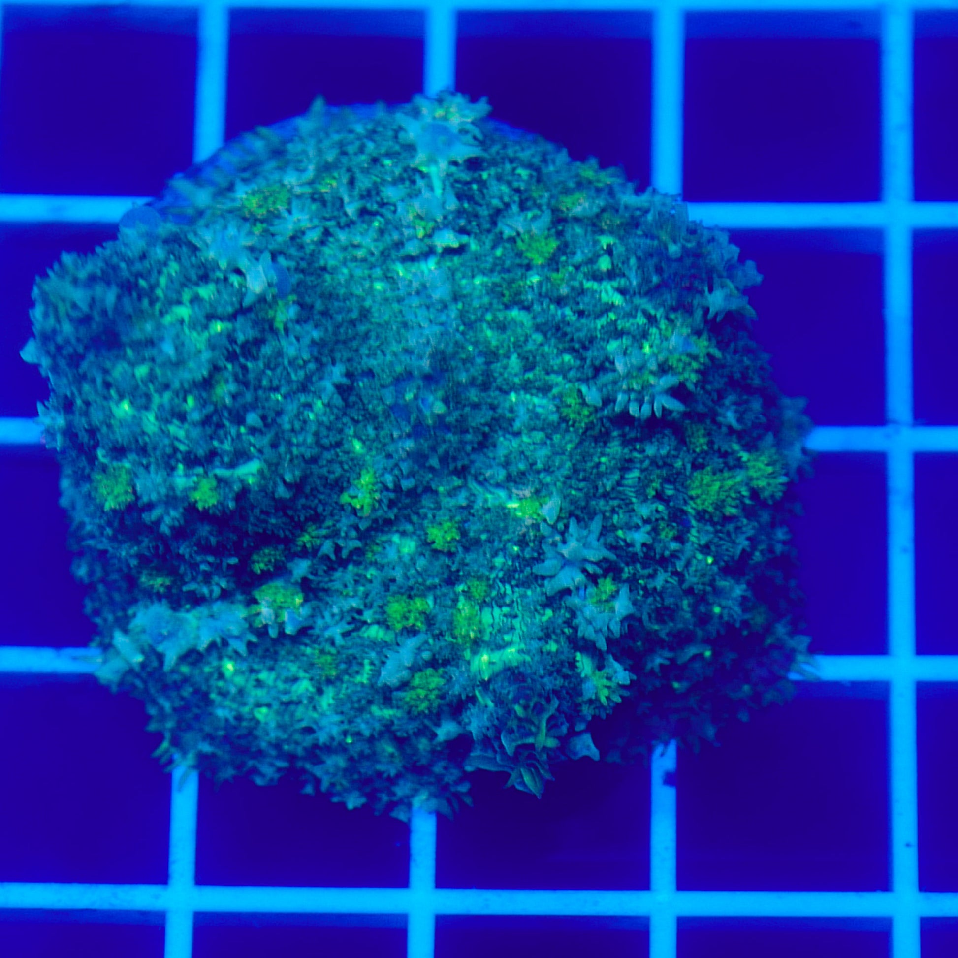 Under optimal conditions, bounce mushrooms display exaggerated, pearl-like bubbles that can range from subtle to extreme, giving them a sculptural, almost unreal appearance. Their glow under blue lighting makes them a true centerpiece coral, whether placed on the sandbed or allowed to attach naturally to rock.