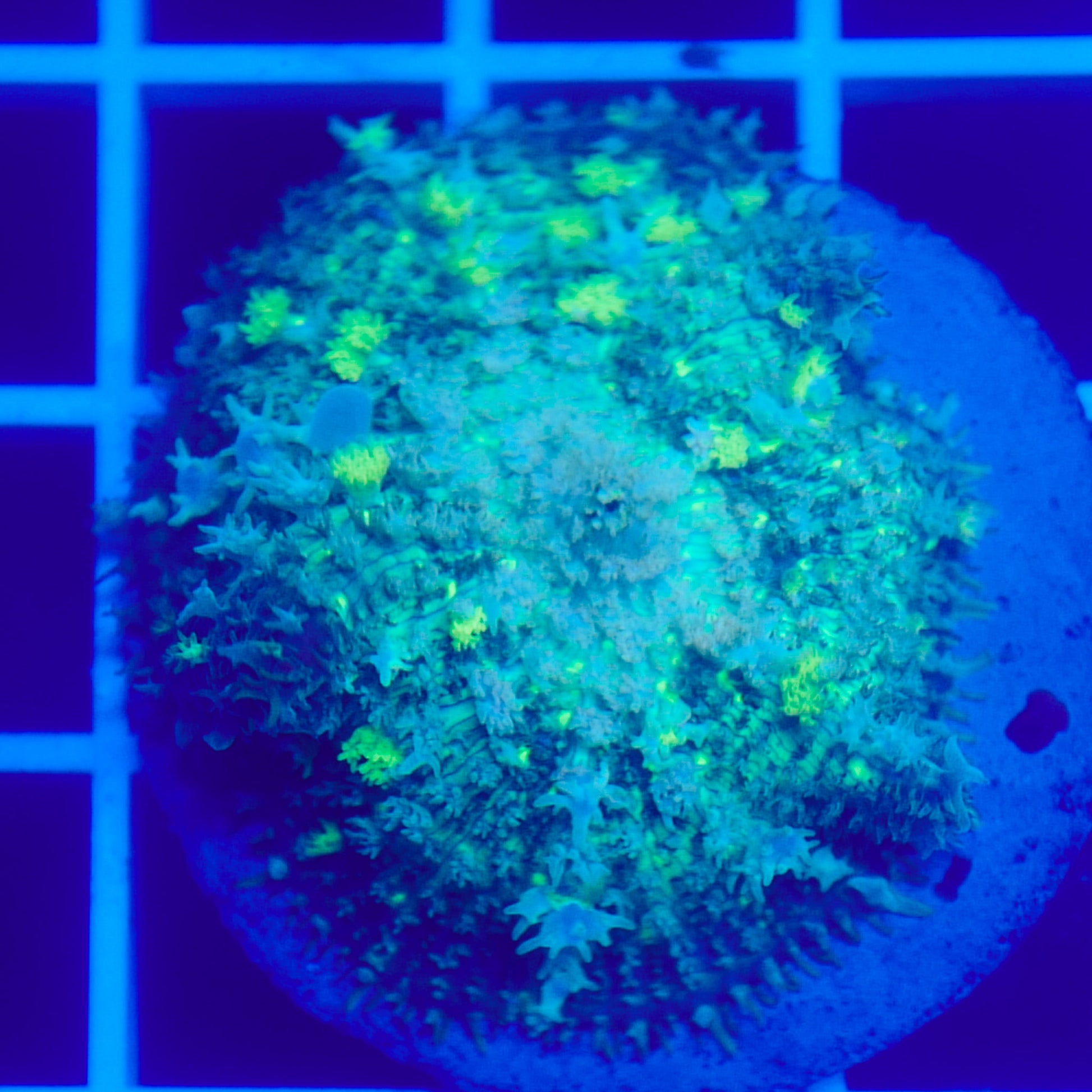 Under optimal conditions, bounce mushrooms display exaggerated, pearl-like bubbles that can range from subtle to extreme, giving them a sculptural, almost unreal appearance. Their glow under blue lighting makes them a true centerpiece coral, whether placed on the sandbed or allowed to attach naturally to rock.