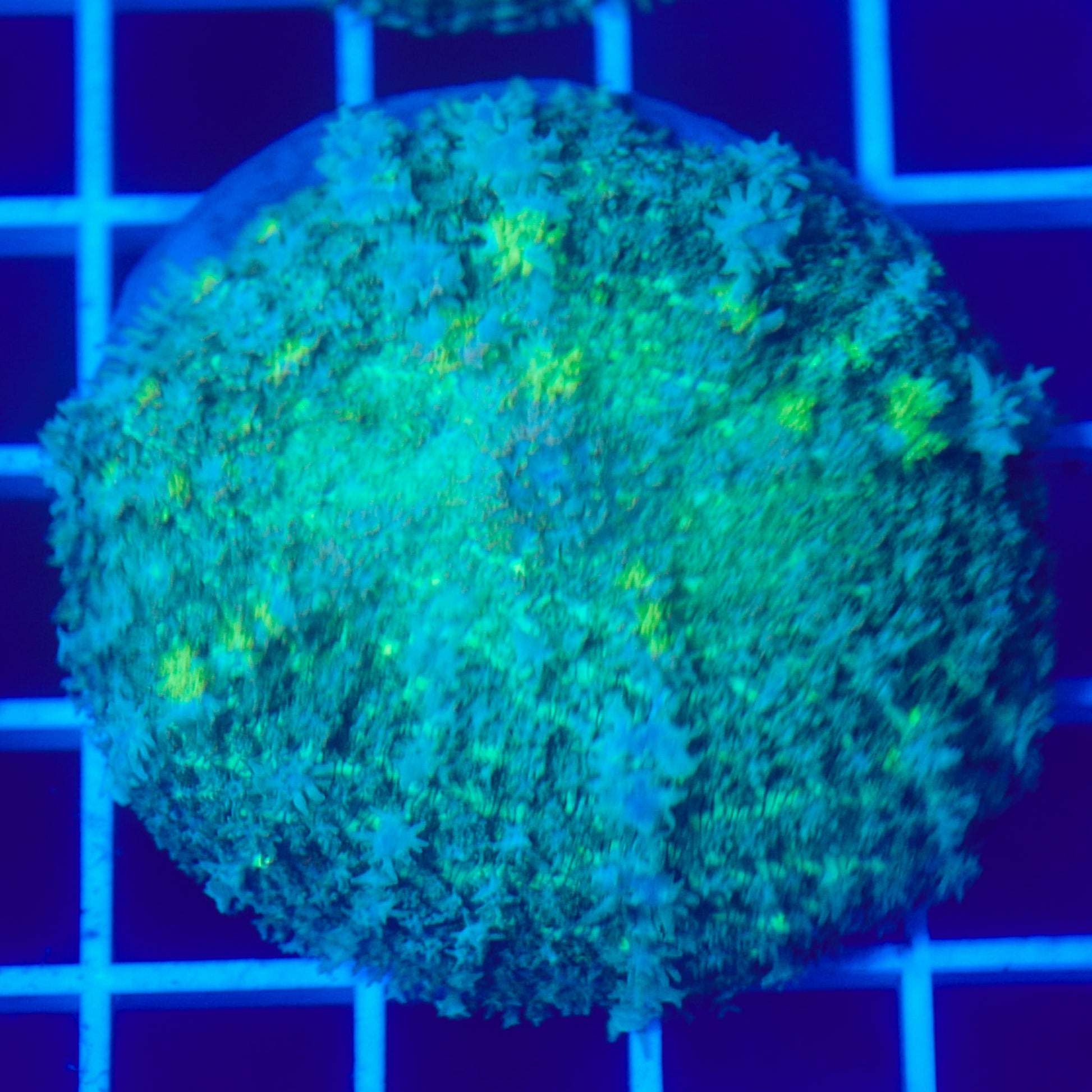 Under optimal conditions, bounce mushrooms display exaggerated, pearl-like bubbles that can range from subtle to extreme, giving them a sculptural, almost unreal appearance. Their glow under blue lighting makes them a true centerpiece coral, whether placed on the sandbed or allowed to attach naturally to rock.