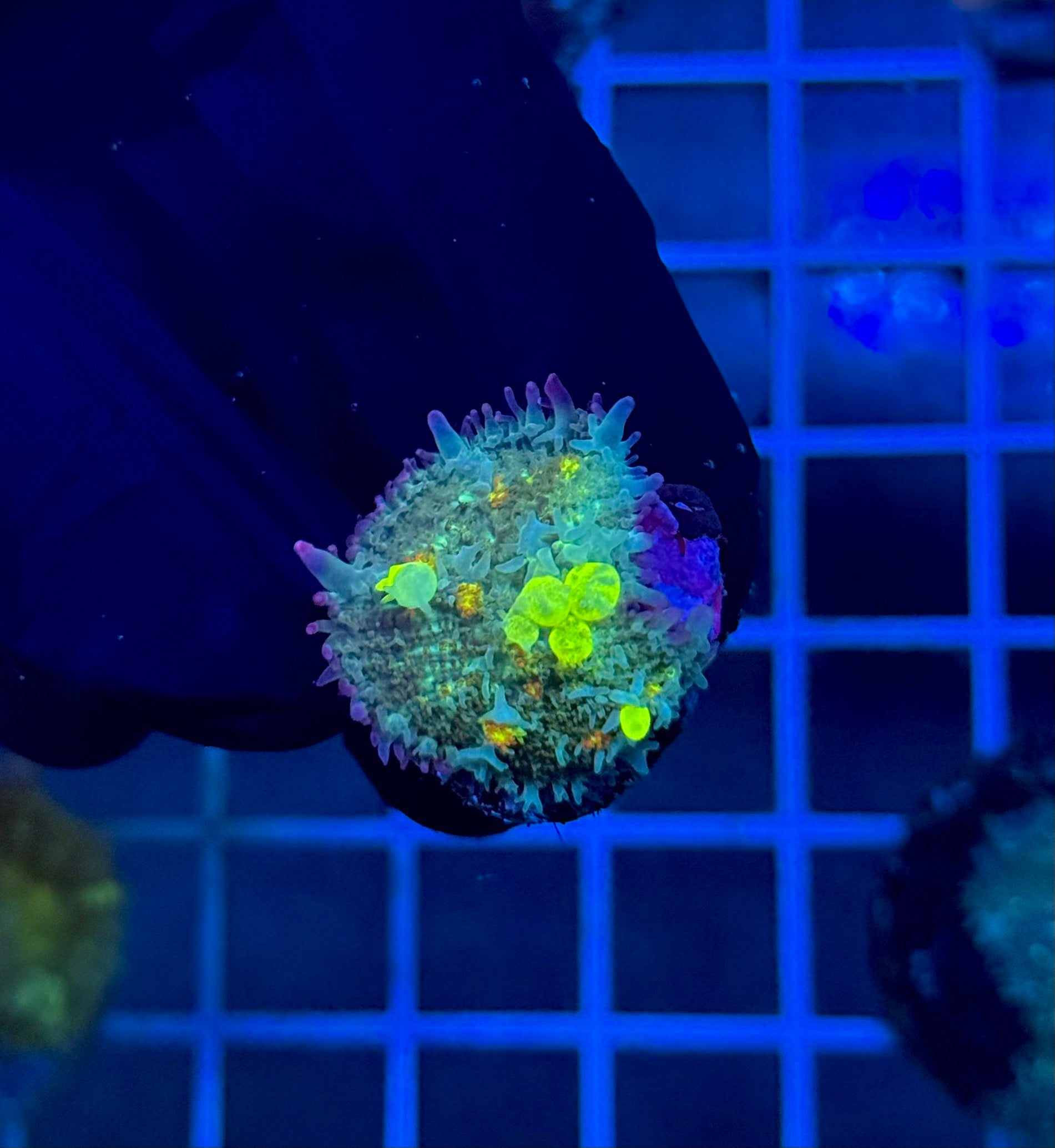 Under optimal conditions, bounce mushrooms display exaggerated, pearl-like bubbles that can range from subtle to extreme, giving them a sculptural, almost unreal appearance. Their glow under blue lighting makes them a true centerpiece coral, whether placed on the sandbed or allowed to attach naturally to rock.