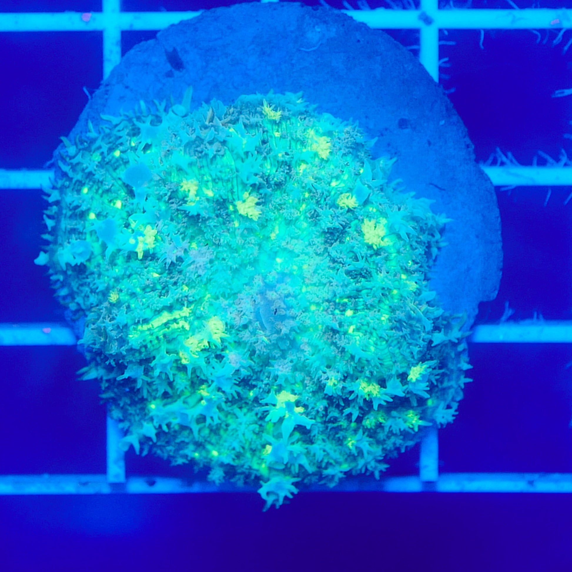 Under optimal conditions, bounce mushrooms display exaggerated, pearl-like bubbles that can range from subtle to extreme, giving them a sculptural, almost unreal appearance. Their glow under blue lighting makes them a true centerpiece coral, whether placed on the sandbed or allowed to attach naturally to rock.