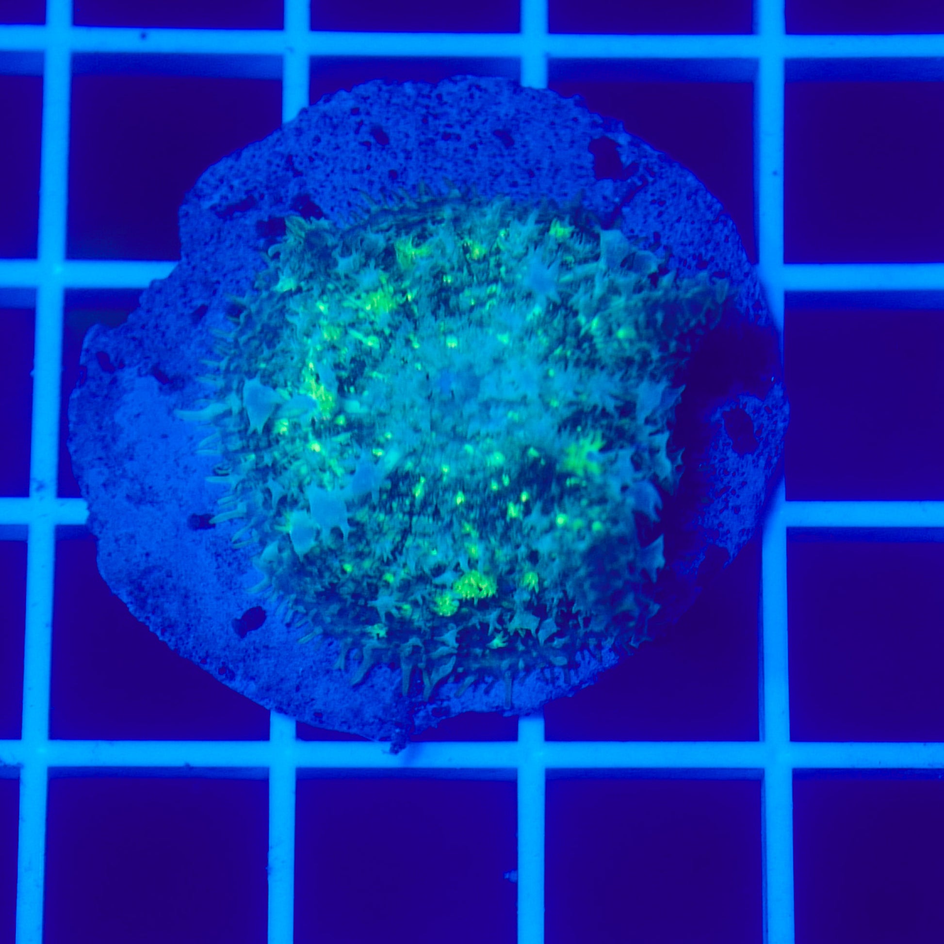 Under optimal conditions, bounce mushrooms display exaggerated, pearl-like bubbles that can range from subtle to extreme, giving them a sculptural, almost unreal appearance. Their glow under blue lighting makes them a true centerpiece coral, whether placed on the sandbed or allowed to attach naturally to rock.