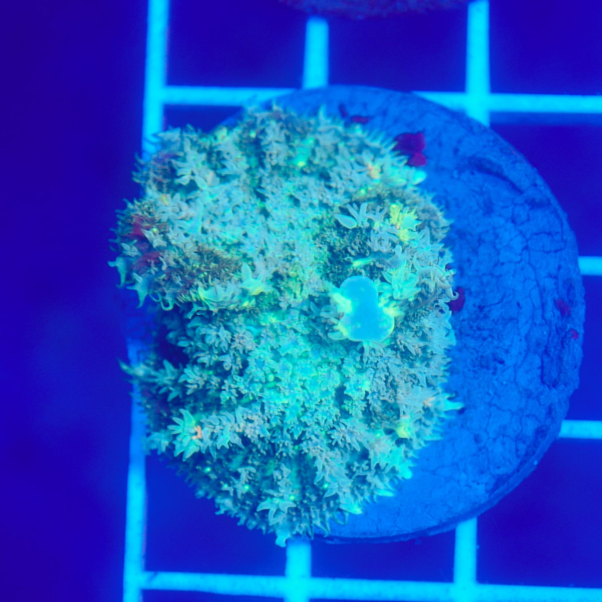 Under optimal conditions, bounce mushrooms display exaggerated, pearl-like bubbles that can range from subtle to extreme, giving them a sculptural, almost unreal appearance. Their glow under blue lighting makes them a true centerpiece coral, whether placed on the sandbed or allowed to attach naturally to rock.