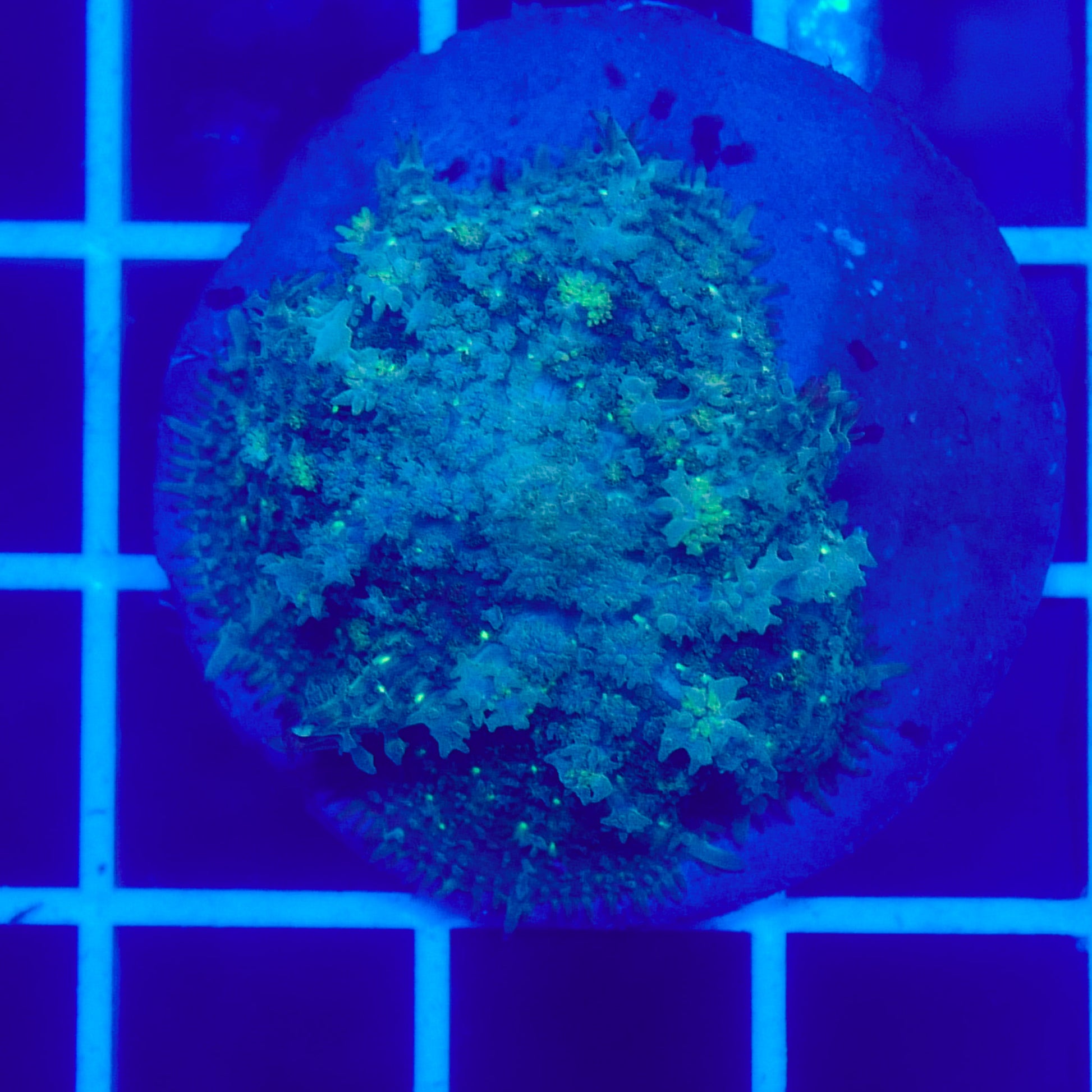 Under optimal conditions, bounce mushrooms display exaggerated, pearl-like bubbles that can range from subtle to extreme, giving them a sculptural, almost unreal appearance. Their glow under blue lighting makes them a true centerpiece coral, whether placed on the sandbed or allowed to attach naturally to rock.
