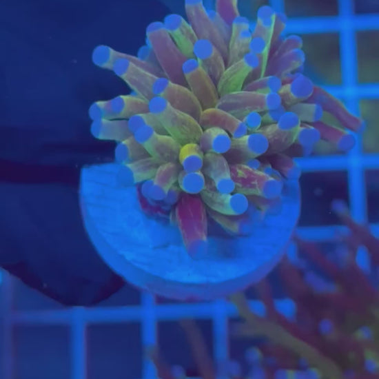 This torch features long, elegant tentacles tipped with vibrant hues that shimmer under blue lighting, creating that signature “glitter” effect reefers chase. Whether you’re building a high-end Euphyllia garden or looking for a single centerpiece, this coral delivers both motion and color.