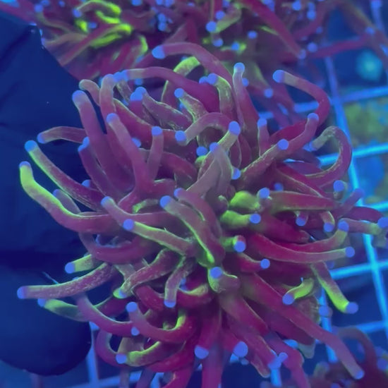 This torch features long, elegant tentacles tipped with vibrant hues that shimmer under blue lighting, creating that signature “glitter” effect reefers chase. Whether you’re building a high-end Euphyllia garden or looking for a single centerpiece, this coral delivers both motion and color.