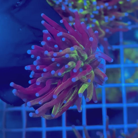 This torch features long, elegant tentacles tipped with vibrant hues that shimmer under blue lighting, creating that signature “glitter” effect reefers chase. Whether you’re building a high-end Euphyllia garden or looking for a single centerpiece, this coral delivers both motion and color.