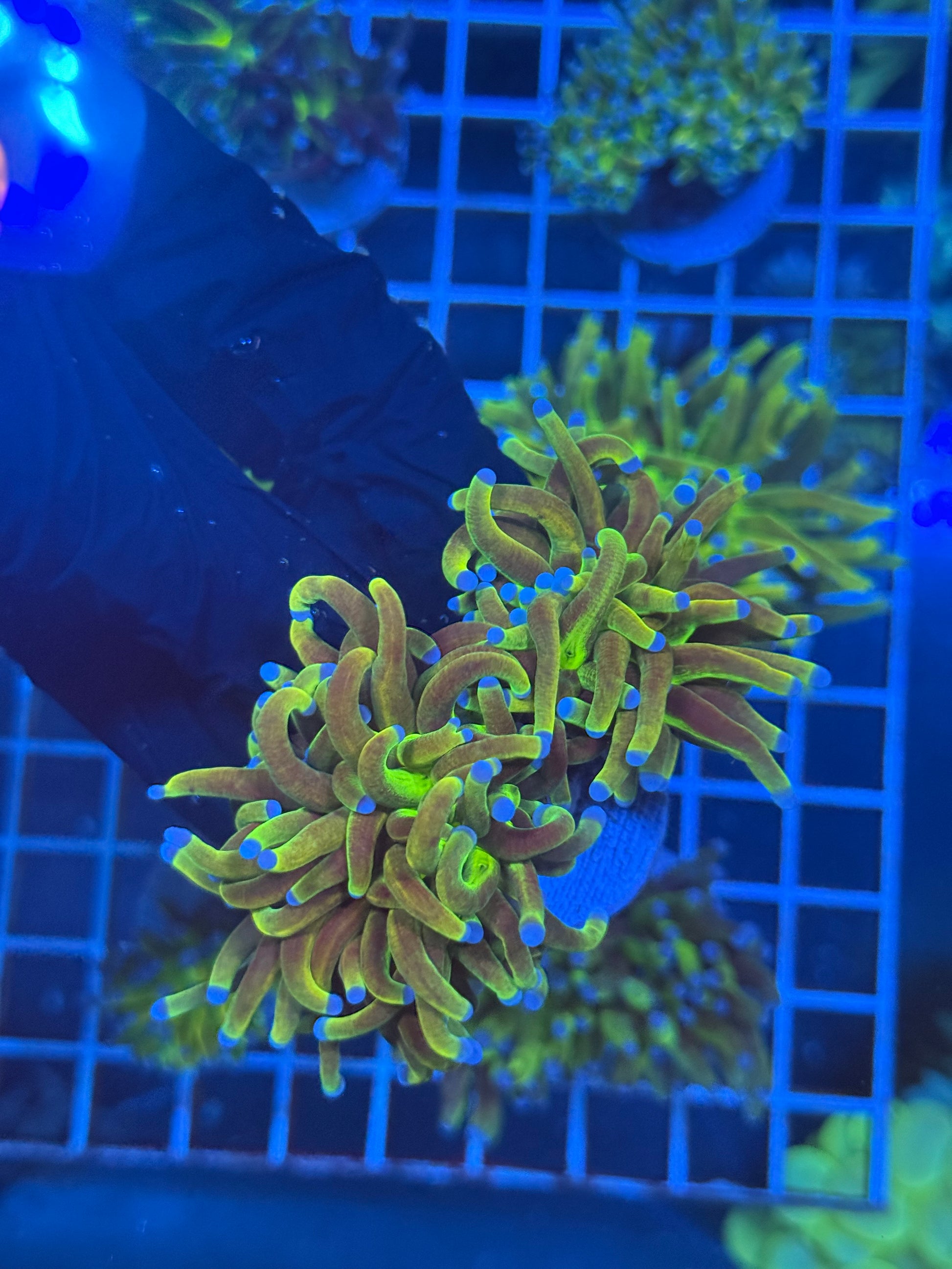 This torch features long, elegant tentacles tipped with vibrant hues that shimmer under blue lighting, creating that signature “glitter” effect reefers chase. Whether you’re building a high-end Euphyllia garden or looking for a single centerpiece, this coral delivers both motion and color.