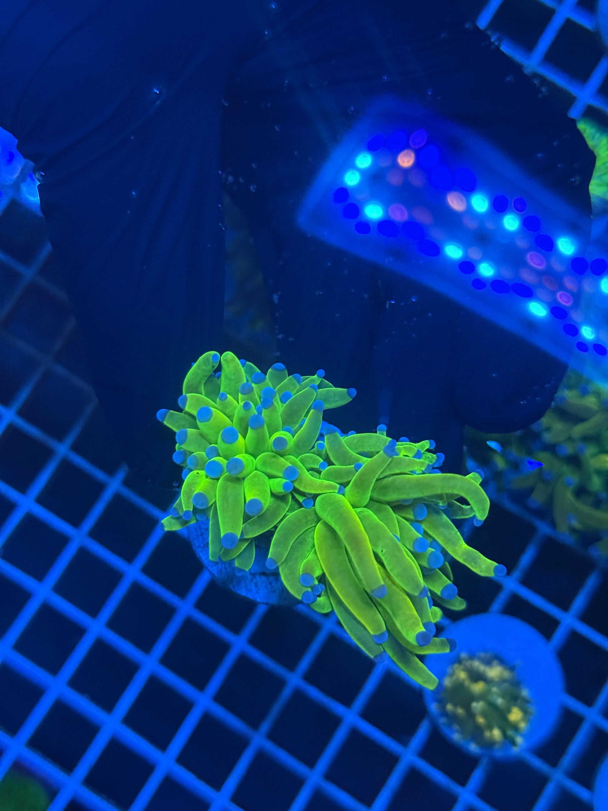 The Holy Grail Torch is a rare and striking Euphyllia variant, instantly recognizable by its bright, neon green color.
