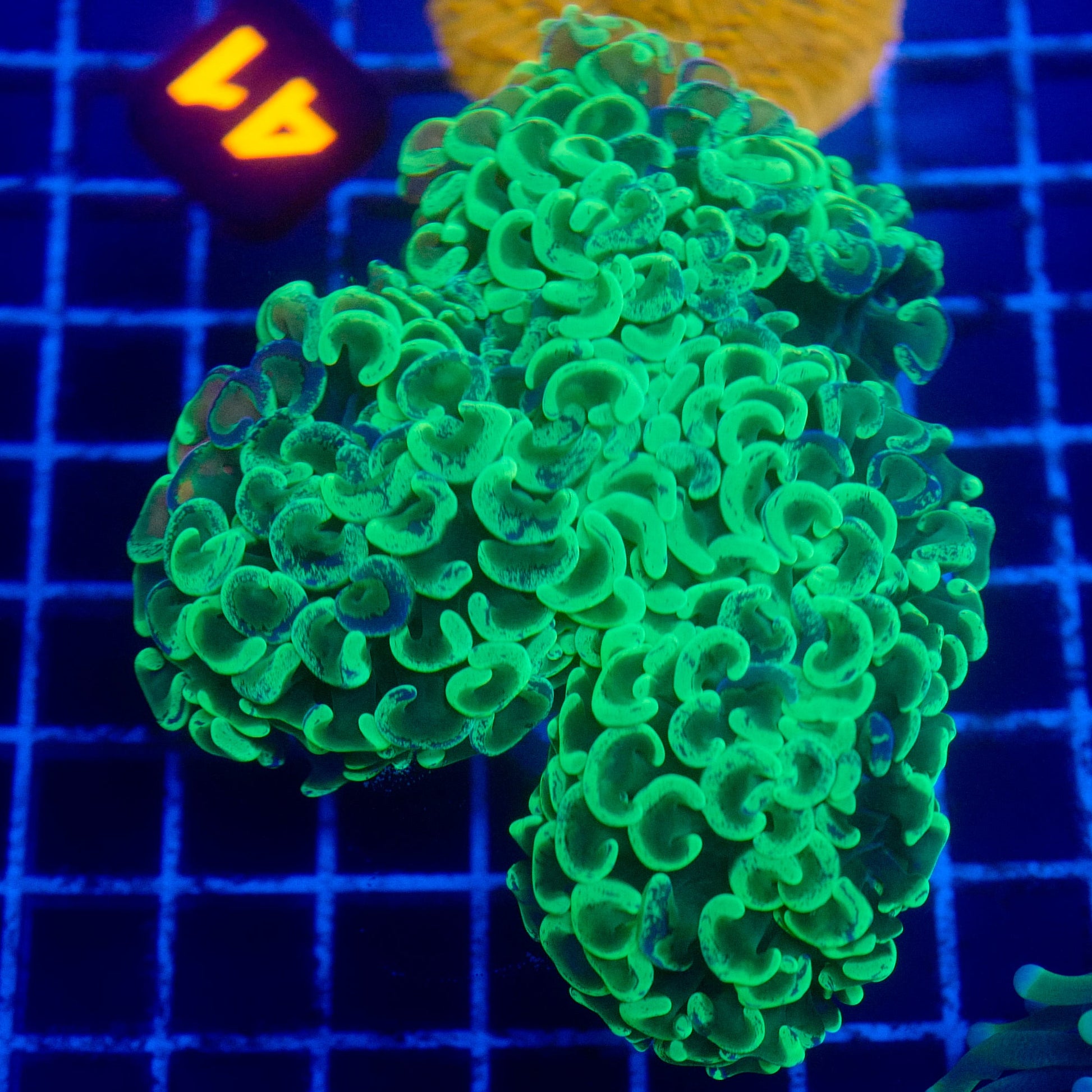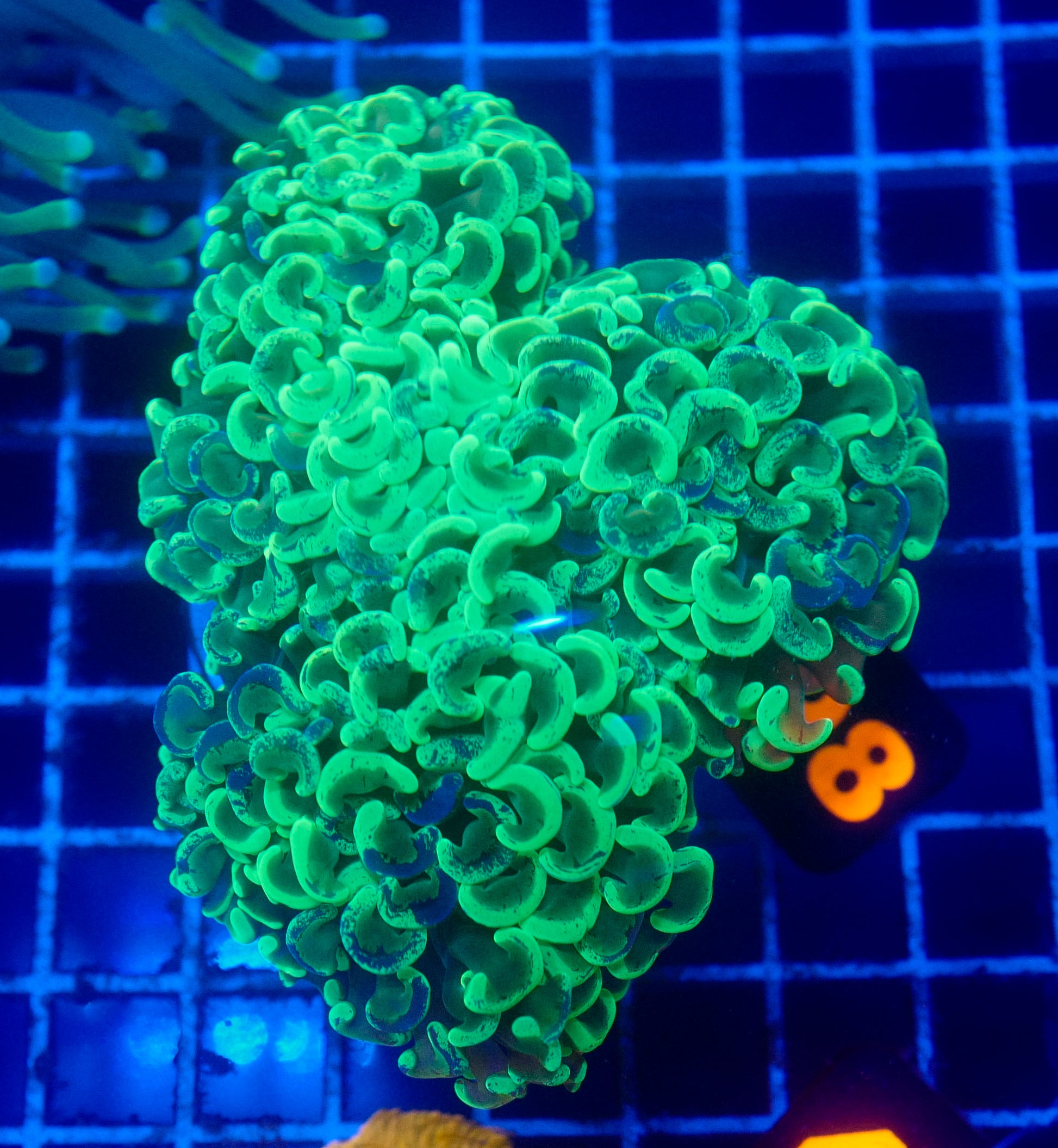 Unlike branching varieties, wall-form hammers grow as a solid, meandering structure that delivers a broad sweep of motion and light-reflecting color across the sandbed or reef base. The toxic coloration makes this piece especially desirable among collectors building high-fluorescence, movement-heavy zones.